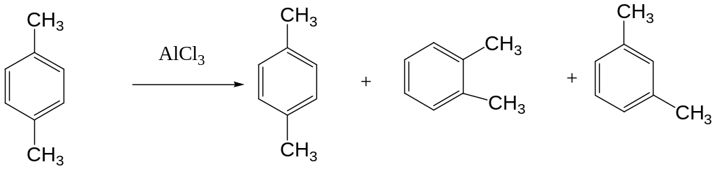 Вторым процессом, приводящим к изомерным продуктам, является изомеризация промежуточного -комплекса. Так, при метилировании толуола метилхлоридом наряду с орто- и пара-ксилолом образуется и значительное количество мета-ксилола. Образование мета-ксилола наблюдается также при нагревании п-ксилола с хлористым алюминием.