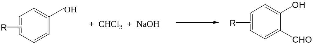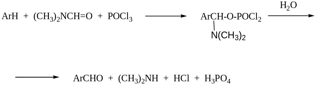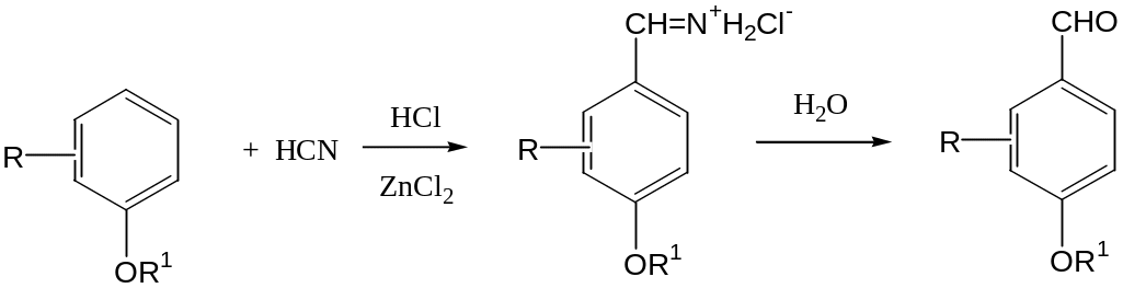 Модификация этого процесса, известная как реакция Гаттермана-Коха, состоит в конденсации ароматического соединения с оксидом углерода (II) и хлороводородом в присутствии хлористого алюминия при повышенном давлении.