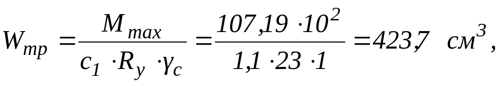 Так как балка сплошного сечения и на нее действует статическая нагрузка, расчет ведем с учетом развития пластических деформаций, причем для прокатных двутавров принимаем c1 = 1,1. Требуемый момент сопротивления двутавра: