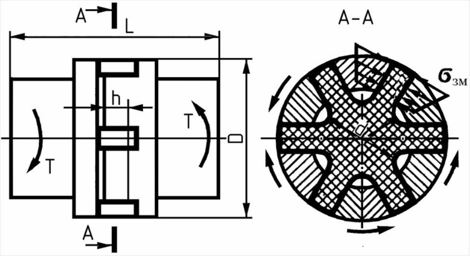 Критерій роботоздатності - руйнування гумової зірочки, розрахунковий критерій - тиск на робочих поверхнях пружного елемента.