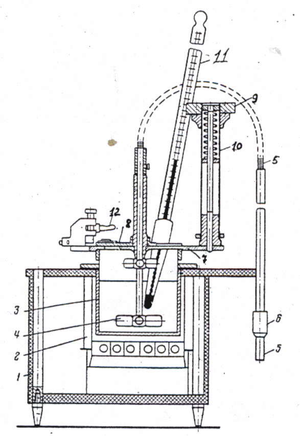 Прибор ПВНЭ устанавливают на специальной платформе с тремя установочными винтами. Он закрыт металлическим кожухом 1, внутри которого в центре укреплен металлический цилиндр 2, являющийся электронагревательной ванной. По боковой поверхности и по дну цилиндра, выложенным асбестом, проходит электрическая спираль, концы которой выведены к двум зажимам на наружной поверхности кожуха для подключения к сети переменного тока через регулятор напряжения - лабораторный автотрансформатор (ЛАТР), позволяющий плавно изменять скорость нагревания испытуемой жидкости. Внутрь цилиндра вставлен латунный стакан 3 для испытуемого продукта. В верхней части стакана имеется риска, указывающая предел наполнения стакана испытуемой жидкостью.