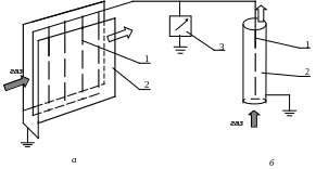 В пластинчатых электрофильтрах (рис. 5.2, а) коронирующими электродами 1 являются также провода того или иного сечения, натянутые в ряд между параллельными пластинами, которые служат осадительными электродами 2.