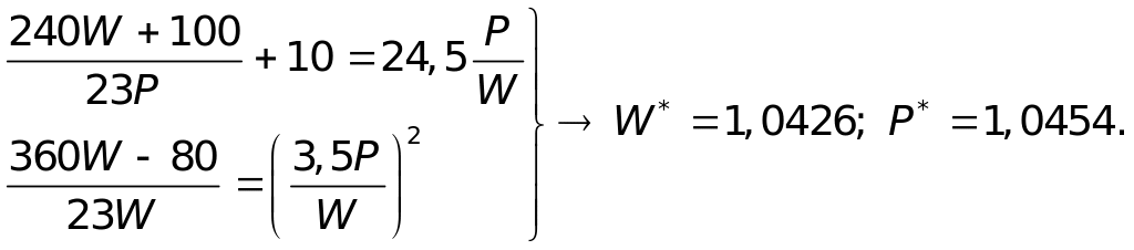 Чтобы конкретно продемонстрировать эффект сокращения государственных расходов в состоянии подавленной инфляции, обратимся вновь к нашему числовому примеру, в котором эта конъюнктура складывается при W = P = 1. Уменьшим закупки государства на рынке благ с 12 до 10 ед. Тогда при прочих неизменных условиях вектор равновесных цен находится из решения системы уравнений