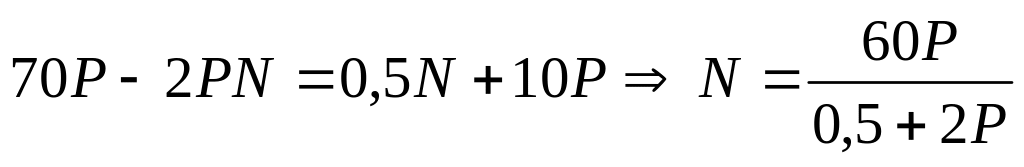 Пример 7.2. Предложение труда отображается функцией NS = 2W – 20, когда домашние хозяйства подвержены денежным иллюзиям и функцией NS = 2W – 20P, когда продавцы труда реагируют на изменение уровня цен; цена предложения труда, соответственно, в первом случае определяется по формуле WS = 0,5N + 10, а во втором – WS = 0,5N + 10P. Производство ведется по технологии, представленной производственной функцией y = 70N – N 2; поэтому цена спроса на труд определяется по формуле WD = 70P – 2PN. В исходном состоянии Р = 1 и занятость находится из равенства 0,5N + 10 = 70 – 2N N = 24; тогда y = 7024 – 242 = 1104.