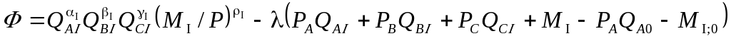 Функции спроса потребителей на каждое из благ и на реальные кассовые остатки выводятся из максимизации функции полезности при заданном бюджетном ограничении. Выведем их для первого потребителя. На основе его функции полезности и бюджетного уравнения составим функцию Лагранжа