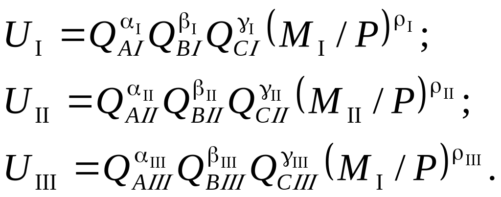 Аналогично выводятся функции спроса на блага и деньги двух других потребителей