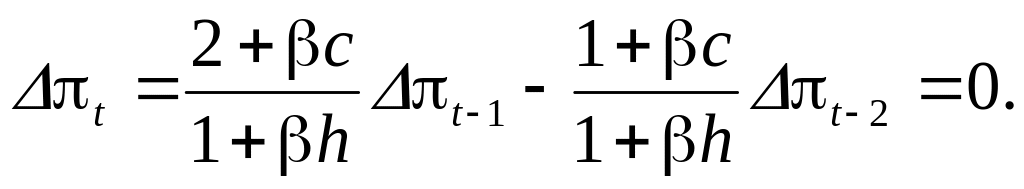 Условие устойчивости динамического равновесия. В приведенных примерах как после монетарного, так и после фискального импульса в экономике возникали затухающие циклические колебания национального дохода и темпа инфляции, т.е. динамическое равновесие было устойчивым. Чтобы выяснить, всегда ли в рассматриваемой модели инфляции динамическое равновесие устойчиво, представим ее в виде однородного конечно-разностного уравнения второй степени.