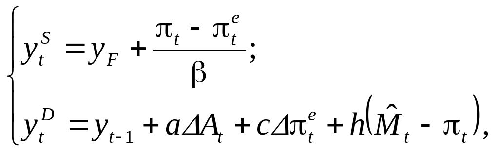Для определения характера колебаний темпа инфляции и величины национального дохода после нарушения динамического равновесия запишем уравнение (10.18) в приращениях