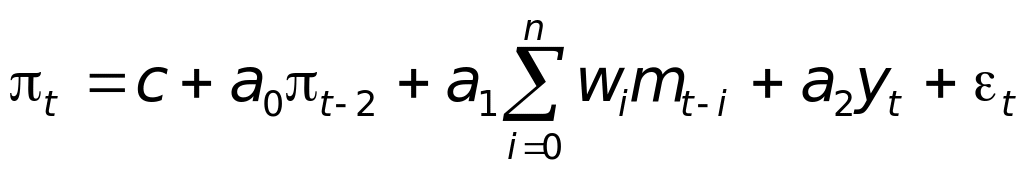 В разделе 10.3. была представлена структурная модель инфляции, основанная на описании поведения каждого макроэкономического субъекта и результата их взаимодействия. В качестве научной концепции она должна быть пригодна для краткосрочного прогноза и способствовать реализации целей кредитно-денежной политики денежных властей. Однако получить фактические данные для практического использования рассмотренной модели, как правило, не удается, так как многие ее параметры не отражаются в экономической статистике. Для практических целей обычно используют простые эконометрические модели инфляции, констатирующие зависимости между небольшим числом макроэкономических показателей реального и монетарного секторов национального хозяйства. Примером может служить выявленная сотрудниками ИЭПП по данным развития инфляции в России в 1996-1997 гг. следующая зависимость72: