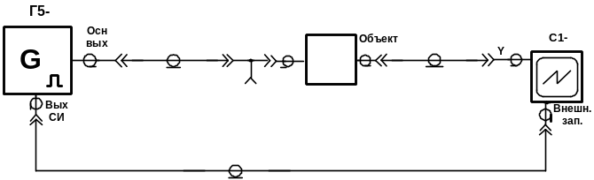 1 − генератор импульсов; 2,4 − радиочастотные кабели РК50−2−11 длиной 0,8 м; 3 − объект измерений; 5 − осциллограф С1−67.