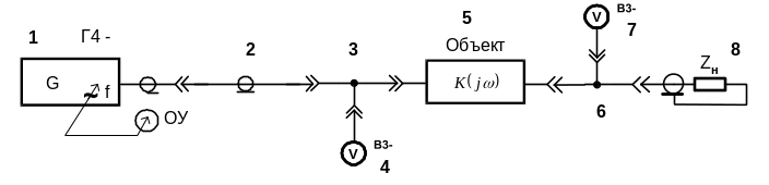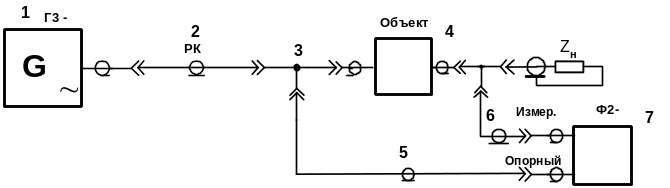 1 − генератор Г3−112; 2,5,6 − радиочастотные кабели РК50−4 длиной 1 м; 3 − тройниковый коаксиальный переход; 4 − объект измерений (усилитель); 7 − фазометр Ф2−13.
