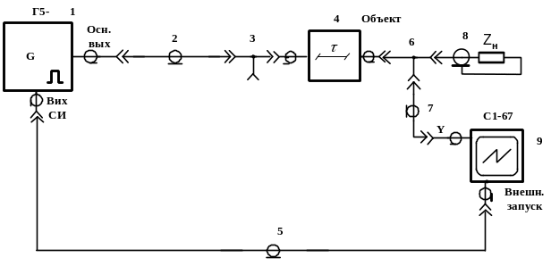 1−генератор Г5−75; 2,5,7 −радиочастотные кабели; 3,6 −коаксиальные тройники; 4−объект исследования; 8−оконечная нагрузка 50 Ом; 9−осциллограф С1−67.