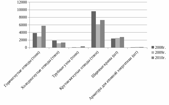 Из таблицы 5 и рисунка 2 видно, что в 2010 году производство каждого вида арматуры для магистральных трубопроводов и атомной энергетики превысило аналогичные показатели 2008 и 2009 годов. Это стало возможным благодаря консолидации всего производства арматуры для магистрального трубопроводного транспорта. Суть консолидации заключается в создании компании ЗАО «ЧТПЗ – Комплексные Трубные Системы» (ЧТПЗ-КТС), которая объединяет в своей структуре различные звенья единой производственно-технологической цепи, от производства соединительных деталей трубопроводов (СДТ) и придания им дополнительных потребительских свойств, до конечной реализации продукции потребителям.