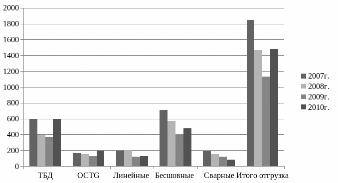 По рисунку 1 видно, что за период с 2007 по 2010 год объемы реализации линейных и сварных труб постепенно снижаются, это связано с тем, что они не входят в список приоритетной продукции. Основными же направлениями производства являются трубы большого диаметра (ТБД), нефтегазопромысловые трубы (OCTG) и бесшовные трубы. Несмотря на снижение производства в 2008 и 2009 годах, в 2010 году объемы отгрузок труб этих сортаментов вернулись к докризисным показателям 2007 года.