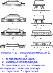 На рис. 4.12 показаны варианты установки микросхем в корпусах с планарными выводами, в круглых корпусах и в плоских прямоугольных корпусах со штырьковыми выводами. Все указанные способы крепления микросхем обеспечивают их надежное крепление в условиях вибрации и ударов, действующих на аппаратуру, которая устанавливается на подвижных объектах (автомашинах, самолетах, судах и т.п.). При этом обязательно покрытие узлов влагозащитными лаками, которое обеспечивает дополнительное крепление выводов микросхемы к плате.