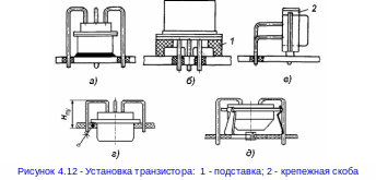 Транзисторы, установленные, как показано на рис. 4.11, д, могут работать при больших механических воздействиях, однако обеспечивают более надежный электрический контакт с корпусом (экран). Такая установка применяется, в основном, для крепления высокочастотных транзисторов типа ГТ311, ГТ313 и т.п.