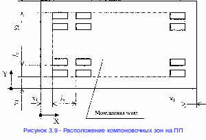 Площадь ПП состоит из рабочей (монтажной) зоны и зоны краевого поля, предусматриваемого для вспомогательных целей (размещения разъемов, крепежных отверстий, зон для направляющих элементов и т.п.) (рис. 3.8).