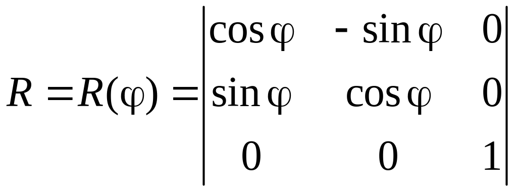 Таким образом, рассматриваемая матрица M01 будучи примененной к точке A0 поворачивает ее на угол φ в положительном направлении как на рис. 2.5. Эту матрицу целесообразно выделить как очередную типовую элементарную матрицу, задающую преобразование вращения, и обозначать ее будем R или R(φ), т.е.