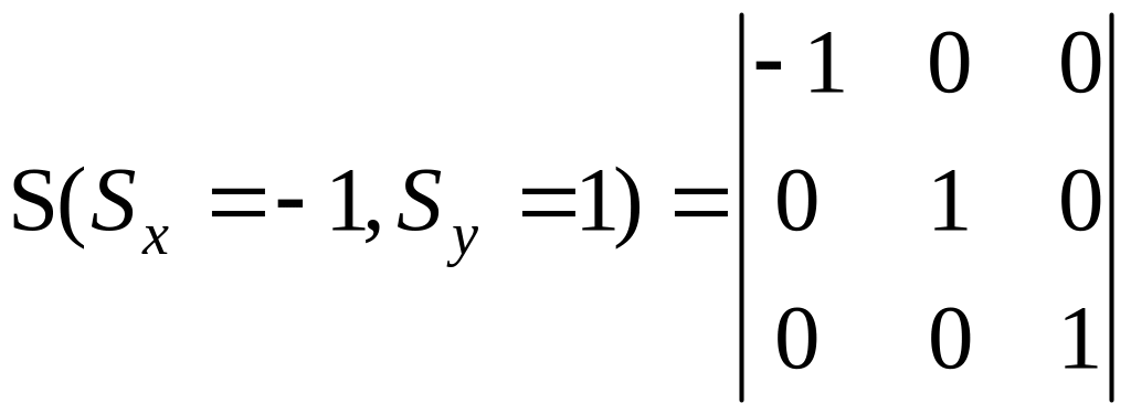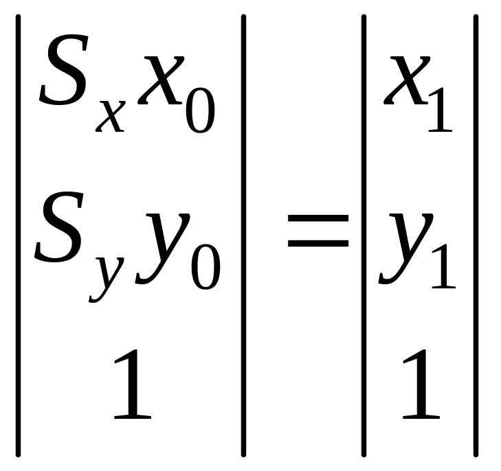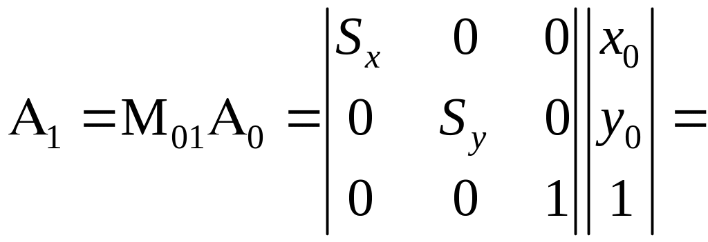 Здесь x – координата точки A0 масштабируется на коэффициент Sx; y – на коэффициент Sy. Рассматриваемую матрицу можно выделить как следующую типовую элементарную матрицу, задающую преобразование масштабирования, и обозначать ее будем S или S(Sx, Sy), т.е.