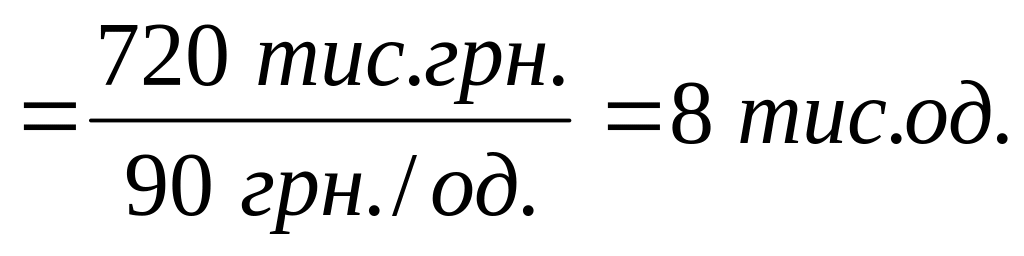 Задача 1. Визначити точку беззбитковості у вартісному і натуральному виразі, якщо на підприємстві ціна виробу становить 120 грн., змінні витрати – 90 грн./шт., постійні витрати за місяць – 15450 грн., місячний обсяг реалізації – 1000 шт.