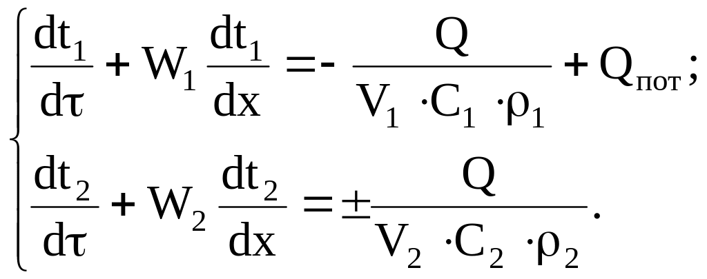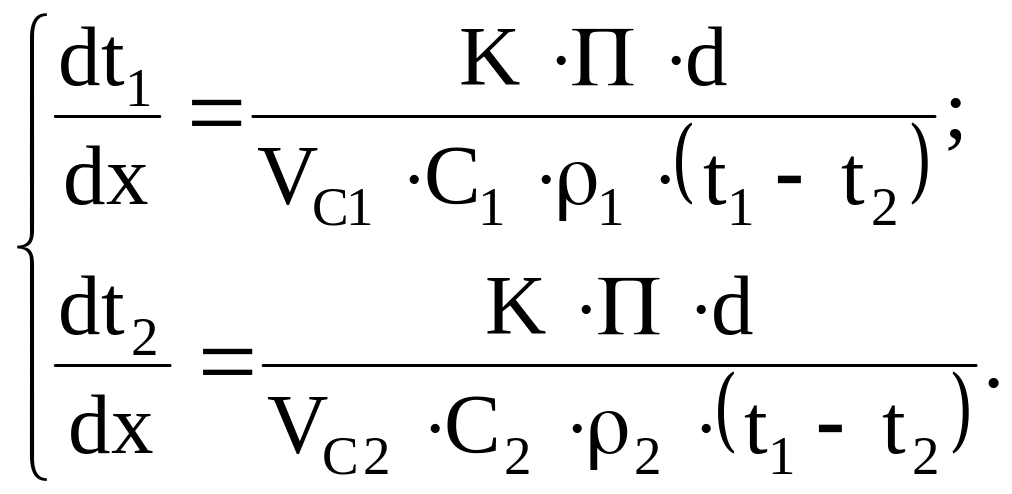 Решая эту систему дифференциальных уравнений при соответствующих условиях однозначности, можно получить распределение температур теплоносителей по длине теплообменника. Для случая прямотока во втором уравнении следует в правой части поставить знак плюс.