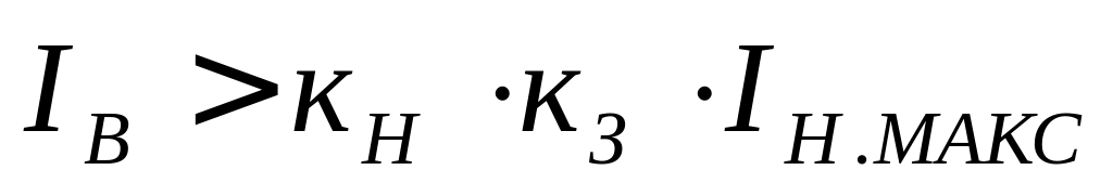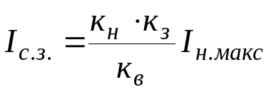 кз – коэффициент самозапуска электродвигателей. Введен в формулу для того, чтобы обеспечить несрабатывание защиты в режиме самозапуска. Определяется как отношение максимального тока самозапуска нагрузки Iсзн к максимальному рабочему току нагрузки Iн.макс , т.е. кз = Iсзн / Iн.макс. Обычно кз =2-3. Коэффициент необходимо рассчитывать для конкретной схемы и условий. Формула может быть видоизменена при замене кз • Iн.макс = Iсзн . Для бытовой и сельскохозяйственной нагрузки кз не рассчитывается, а принимается равным 1,2-1,5;