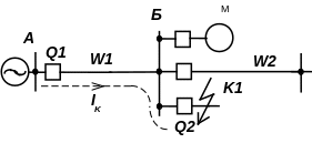 В момент времени tо возникло к.з. в точке К1, которое отключается в момент времени t1 защитой, установленной на Q2 . После отключения к.з. начинается процесс самозапуска электродвигателей М, подключенных к шинам подстанции Б. Чтобы защита у шин п/ст А (на Q1 ) вернулась в несработанное состояние, в момент t1 ток должен снизиться так, чтобы