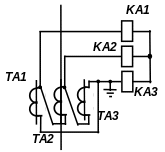 Вторичные обмотки трансформаторов тока трех фаз соединяются в треугольник, а три токовых реле включены на разность токов двух фаз. Коэффициент схемы