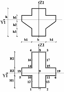 2. Центр тяжести вычисляется для реального сечения. 3. Точки 5 и 6 всегда лежат на пересечении оси Y1 с контуром крестового сечения. 4. Точки 10, 11, 14, 15 принадлежат стенке у стыка с поперечиной. 5. Точки 12, 13, 16 и 17 лежат на серединах высот H1 и H2. 6. Точки 18 и 19 расположены посредине высоты H3. 7. Всего 19 точек. |