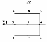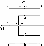 1. Точки 5 и 6 всегда лежат на пересечении оси Y1 с контуром сечения. 2. Точки 7 и 8 всегда лежат на пересечении оси Z1 с контуром сечения. 3. Точки 10, 11, 12, 13 лежат на одной вертикали, проходящей через середину полок. 4. Точки 14 и 15 принадлежат стенке у стыков с полками. 5. Всего 15 точек. |