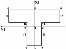 1. Точки 5 и 6 всегда лежат на пересечении оси Y1 с контуром сечения. 2. Точки 10 и 11 принадлежат стенке тавра у стыка с полкой. 3. Точки 12 и 13 расположены посредине высоты стенки. 4. Точки 14 и 15 расположены посредине высоты полки. 5. Всего 15 точек. |