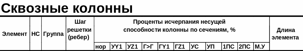 Форма таблицы зависит от вида элемента. Существуют таблицы для БАЛОК, СПЛОШНЫХ КОЛОНН, СКВОЗНЫХ КОЛОНН, ФЕРМ и КАНАТов. Таблицы результатов имеют следующий вид.