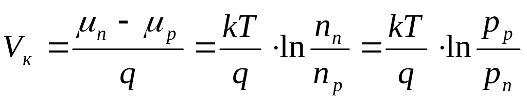 Видно, що КРП Vк не може перевищувати ширину забороненої зони і тим більша, чим більше відношення концентрації основних носіїв заряду до концентрації неосновних, тобто чим більше ступінь легування напівпровідників. Контактний шар простягається в область обох напівпровідників. На основі формули (13.5) одержуємо