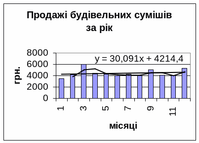 Виконаний трендовий аналіз продажів за минулий рік показує загальну зростаючу тенденцію обсягів реалізації продукції фірми із сезонними піками продажів у березні, вересні і грудні.