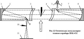 Лучи света от источника света 5 проходят через прямоугольную щель в диафрагме 6 и направляются на сферическое зеркало 8, отразившись от которого они параллельным пучком проходят через менисковую линзу 4. Пройдя через исследуемое поле неоднородности потока, лучи через менисковую линзу 3 попадают на сферическое зеркало 2, отражаясь от которого, они отклоняются диагональным зеркалом 9 и, проходя мимо кромки ножа 10, достигают матового экрана 11 или окуляра зрительной трубы.