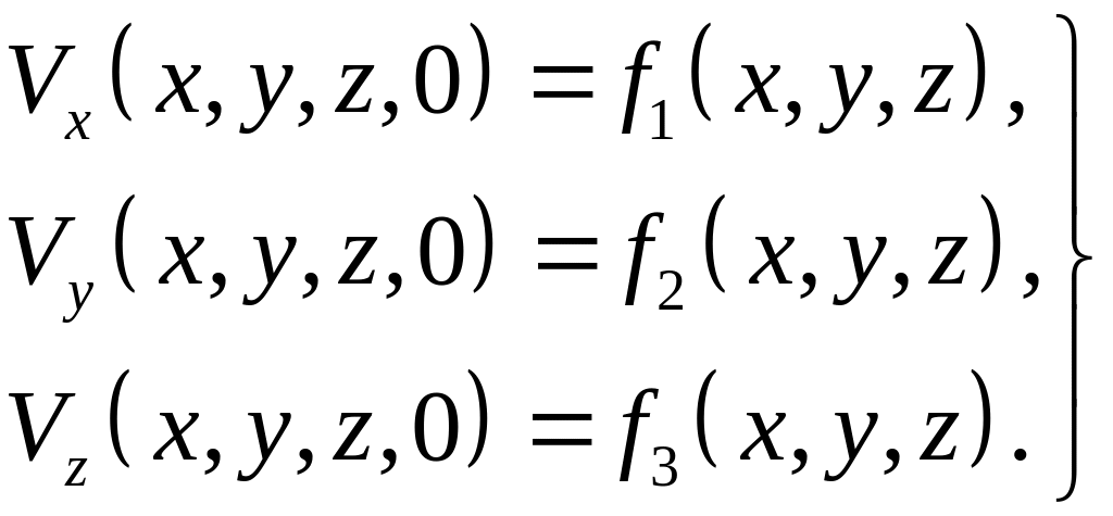 При начальных условиях задается поле скоростей в начальный для данной задачи момент времени, т. е. при t = 0: