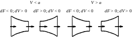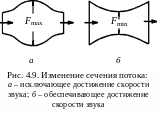 Уравнение (4.21) показывает, что связь между скоростью течения газа V и площадью поперечного сечения F имеет разный характер в зависимости от того, будет ли скорость течения больше или меньше скорости звука (рис. 4.8).