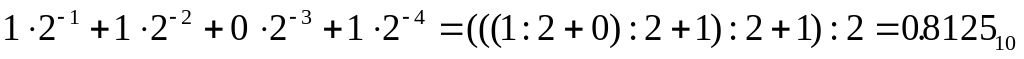 При вычислении десятичного значения р-ичной дроби по развернутой форме с использованием калькулятора также целесообразно пользоваться схемой Горнера, что минимизирует количество арифметических действий и исключает возведение в степень.