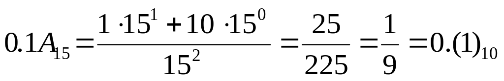 Перевод правильной бесконечной периодической p-ичной дроби в десятичную систему счисления заключается в представлении исходной дроби в виде обыкновенной дроби, в числители которой будет записан период в развернутой форме, а знаменатель – р в соответствующей степени, уменьшенный на единицу.