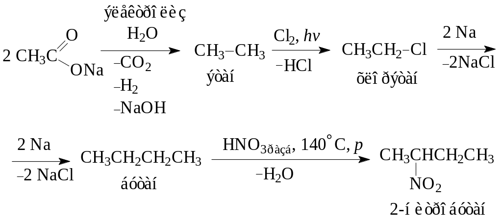 Если в реакции возможно образование смеси изомеров, достаточно привести структурную формулу только одного из них. Другой изомер так же, как и выделяющиеся в результате реакций неорганические вещества, нужно подписать под стрелкой в схеме превращений со знаком «–». Ниже представлен пример выполнения данного задания: