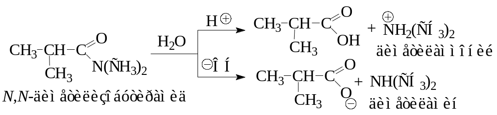 2. Приводим уравнения реакций гидролиза в кислой и щелочной среде N,N-диметилизобутирамида (Б):