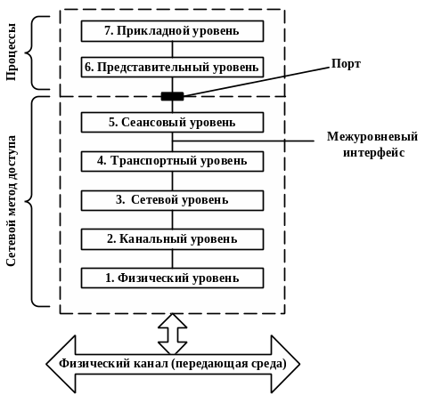 Два старших уровня (6 и 7) соответствуют процессам: представления и преобразования данных, выполнения прикладных программ, административного управления сетью. Остальные уровни определяют сетевой метод доступа к указанным процессам. Точки в процессах, через которые осуществляется эта связь, представляют собой входные и выходные порты.