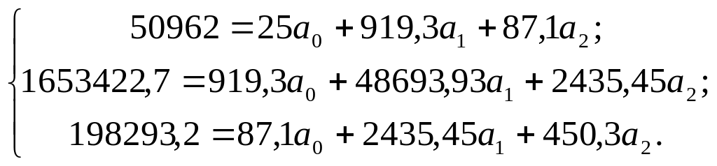 Для решения этой системы нормальных уравнений разделим все члены уравнений на коэффициенты при а0 и получим следующую систему уравнений: