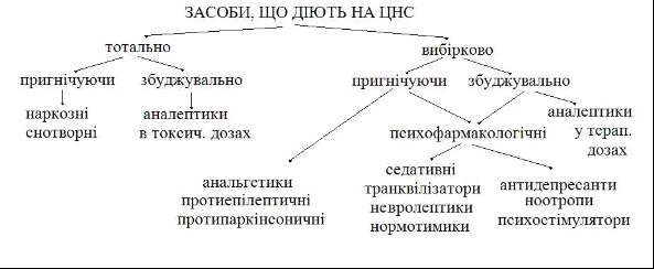 Актуальн³сть розд³ла: Центральна нервова система координуº ³ керуº д³яльн³стю внутр³шн³х орган³в, к³стякових м'яз³в, формуº псих³чну д³яльн³сть людини. За допомогою речовин, що впливають на морфо-функциональні утворення ЦНС, можна зд³йснювати корекц³ю порушених захворюваннями функц³й внутр³шн³х орган³в ³ розлад³в псих³чних функц³й головного мозку - сприйняття, мислення, пам'ят³, настрою, емоц³йного стану. Для забезпечення можливост³ проведення оперативних утручань потр³бно вимикання св³домост³, знеболення, зниження тонусу к³стякових м'яз³в, усунення небажаних рефлекс³в; ц³ ефекти досягаються при використанн³ наркозних засоб³в чи засоб³в загально¿ анестез³¿. Перед практичним л³карем дуже часто стаº проблема знеболення, оск³льки б³ль º одним ³з прояв³в самих р³зноман³тних патолог³чних процес³в (травма, ³шем³я, запалення й ³н.). Ум³ння послабити чи усунути ноцицептивную реакц³ю за допомогою знеболюючих засоб³в повинно входити в арсенал дій л³каря будь-яко¿ спец³альност³. Порушення нервово-псих³чно¿ д³яльност³ - специф³чна форма патолог³¿ людини. Найб³льш розповсюдженими з них º порушення емоц³йного стану (неврози ³ неврозоподобні захворювання) ³ настрою (депрес³¿). Ц³ захворювання можуть бути самост³йними, але часто пов'язан³ з важкими соматичним захворюваннями (г³пертон³чна хвороба, ³шем³чна хвороба серця, виразкова хвороба та ³н). У зв'язку з цим, перед практичним л³карем часто повстаº задача корекц³¿ психо-эмоційного стану людини в комплексн³й терап³¿ ряду захворювань. Нарешт³, у ряд³ випадк³в безпосередньою причиною смерт³ º порушення функц³¿ життºво важливих центр³в (дихального, судинорухового) довгастого мозку. Як засоби швидко¿ допомоги л³кар³ використовують при станах, що загрожують життю хворого, аналептики, які здійснюють збудливу ³ тон³зуючу д³ю на дихальний ³ судиноруховий центри.