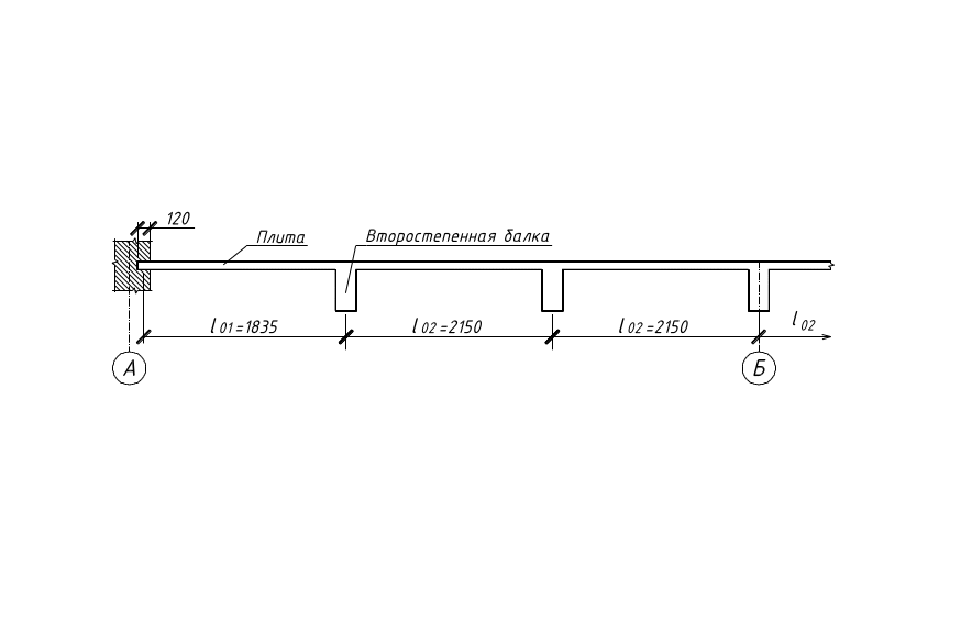 l01 = lплкр + (0,12 / 2) = 1775 + 120 / 2 = 1835 мм, l02 = lплср = 2150 мм.