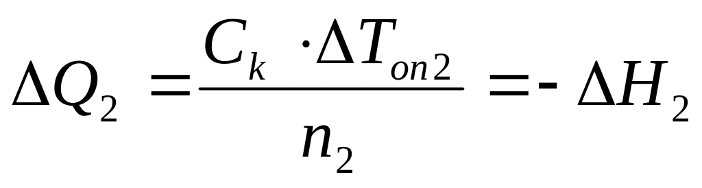 Интегральную теплоту растворения безводной соли и ее кристаллогидрата рассчитывают, используя экспериментальные значения Топ1 и Топ2 и полученное ранее значение Ск, где Топ1 и Топ2 – изменение температуры в езультате растворения n1 моль безводной соли и n2 моль ее кристаллогидрата (соответственно):