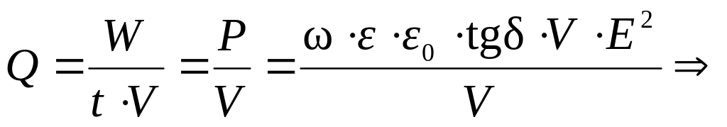 Таким образом, количество теплоты, выделившееся в единице объема диэлектрика за 1секунду, пропорционально квадрату напряженности поля E2, частоте w, диэлектрической проницаемости e и тангенсу угла диэлектрических потерь tgd.