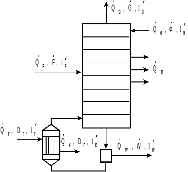 Рис. 4. Схема материальных и тепловых потоков для выделенной части установки непрерывной ректификации