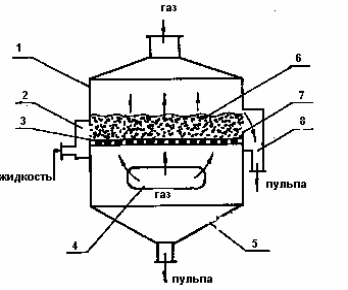 1 - корпус; 2 - приемная коробка; 3 - тарелка; 4 - диффузор для входа запыленного газа; 5 - бункер; 6 - подвижная пена; 7 - порог; 8 - сливная коробка.