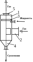 1 - корпус; 2 - входной патрубок; 3 - сопла; 4 - коническое днище; 5 - выходной патрубок.